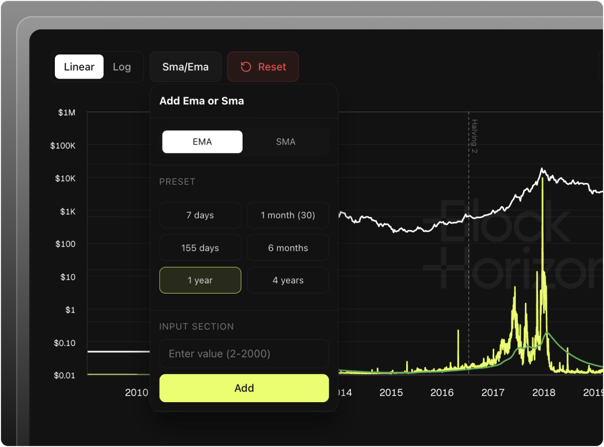 Add Simple Moving Average (SMA) or Exponential Moving Average (EMA) overlays with predefined periods (7, 14, 30, 60, 90, 365 days) or set custom lengths from 2 to 1,000 days for precise trend analysis.